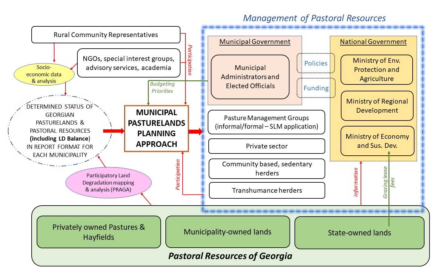The Municipal Pastureland Planning approach was developed and piloted in 3 Georgian Municipalities through the 'Achieving Land Degradation Neutrality Targets of Georgia through Restoration and Sustainable Management of Degraded Pasturelands', initiated by the Ministry of Environment Protection and Agriculture of Georgia and implemented by the Food and Agriculture Organization of the United Nations (FAO); the executive organization was the Caucasus Regional Environmental Center (RECC), in partnership with the Caucasus Environmental Non-Governmental Organization Network (CENN).