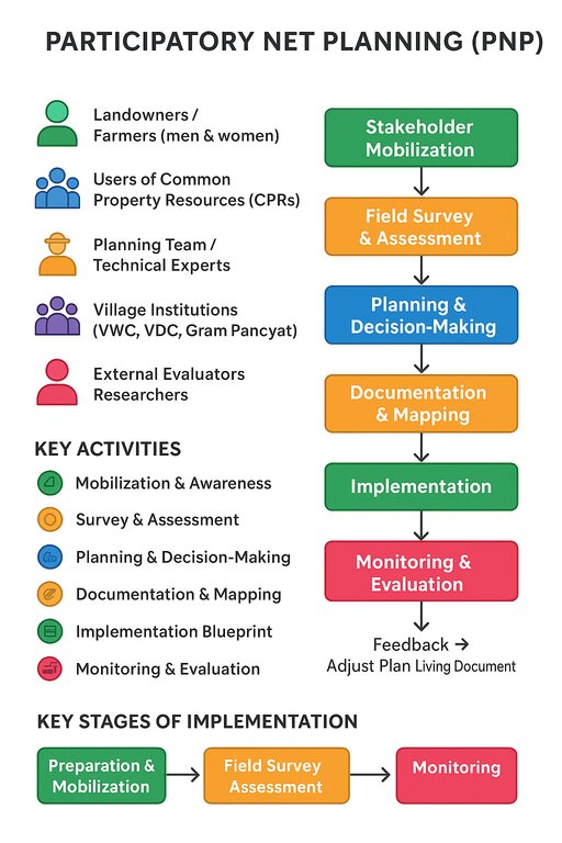 Participatory Net Planning (PNP) is a practical methodology that actively engages landowners and local stakeholders in planning and implementing measures for land use, soil conservation, water harvesting, and biomass development. It aims to regenerate ecosystems and improve the sustainability of watersheds through site-specific resource management. PNP emphasizes the conservation, productivity enhancement, and sustainable use of natural and biological resources. It involves assessing the current condition and use of land, water, and vegetation, and preparing detailed plans—with estimated costs and timelines—to achieve the desired outcomes.