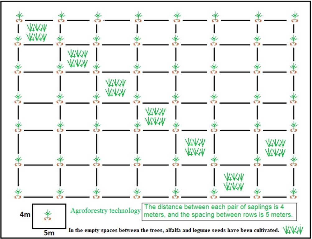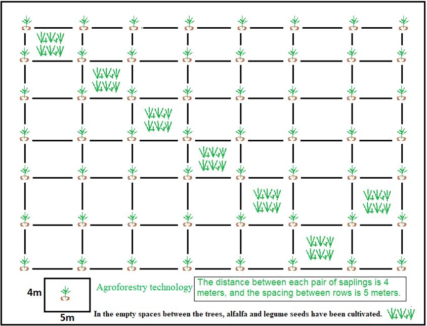 The agroforestry system integrates apple tree plantation with alfalfa intercropping, enhancing land productivity and sustainability by providing both fruit and forage. This technology improves livelihoods and promotes soil fertility and moisture retention for long-term environmental benefits